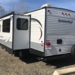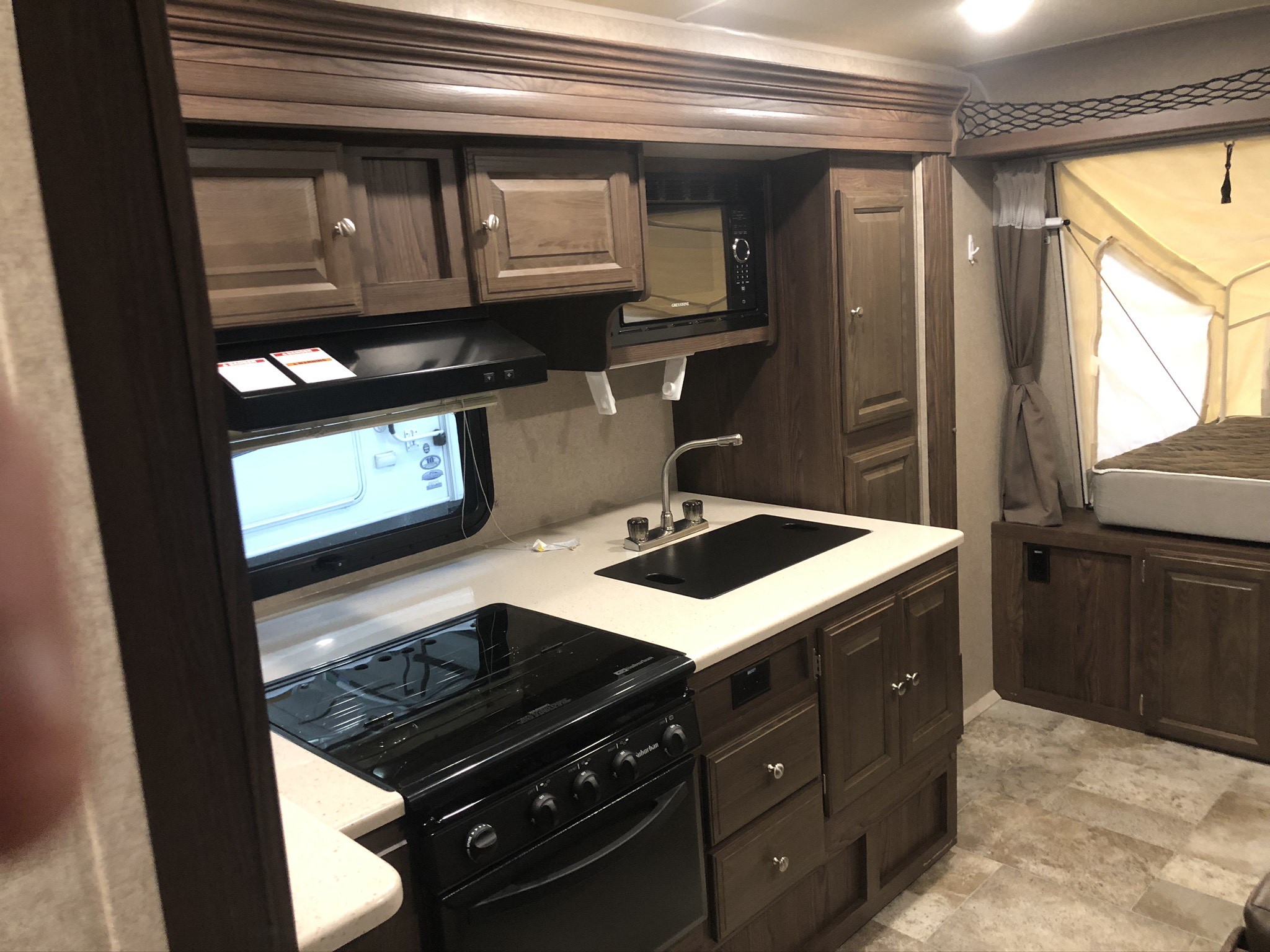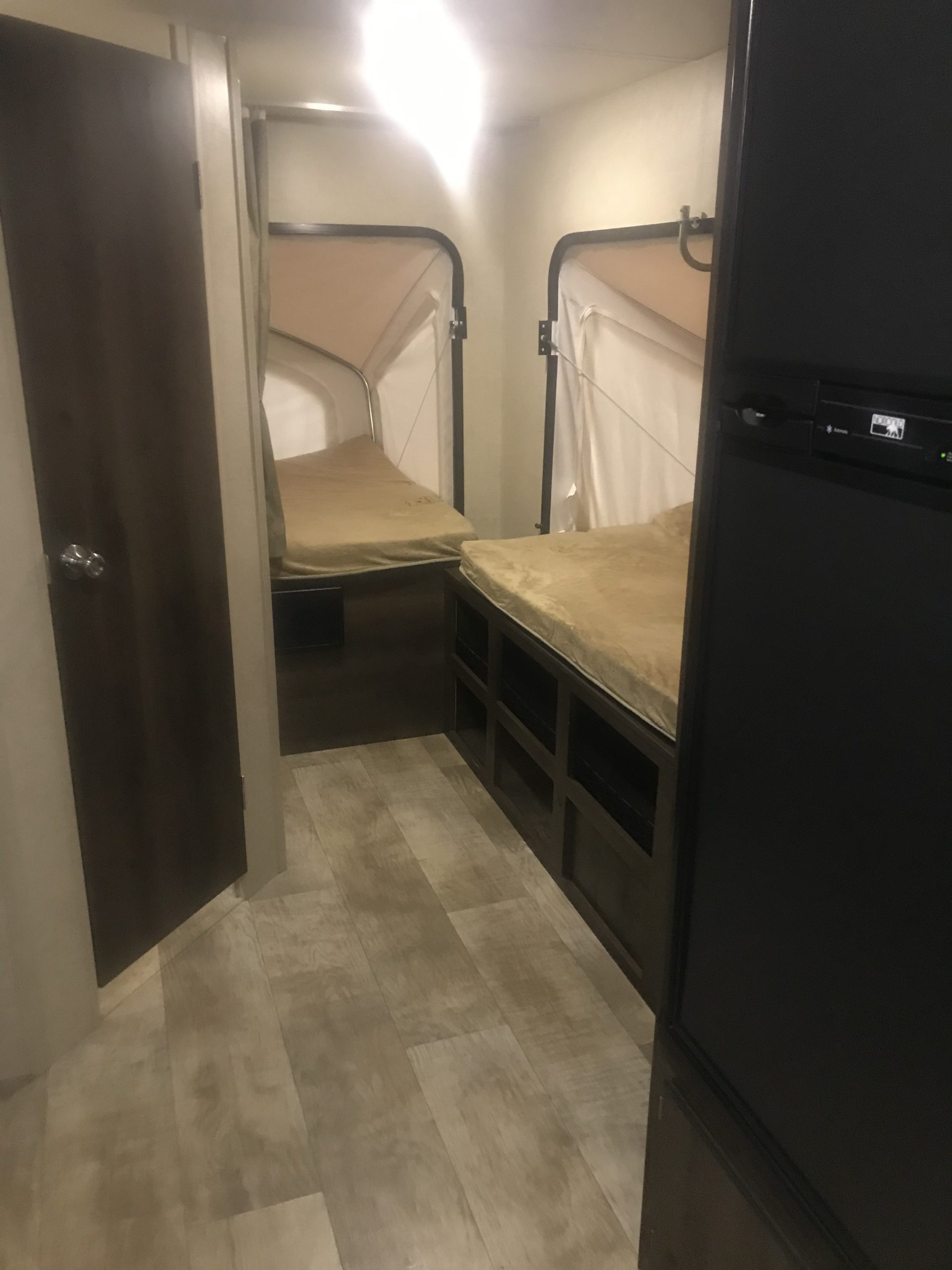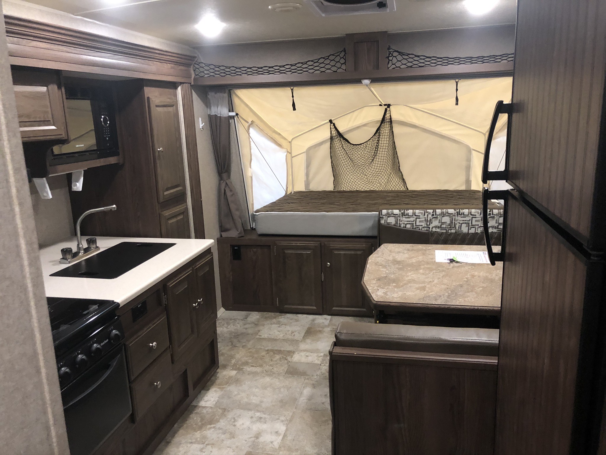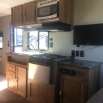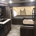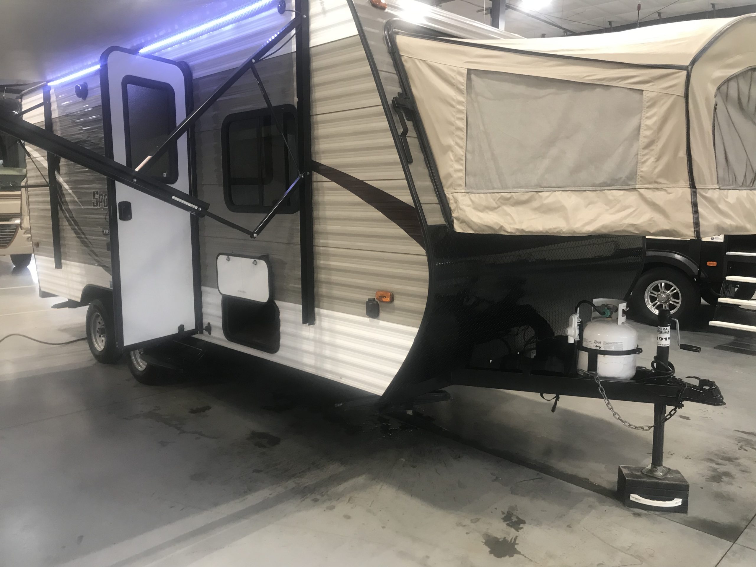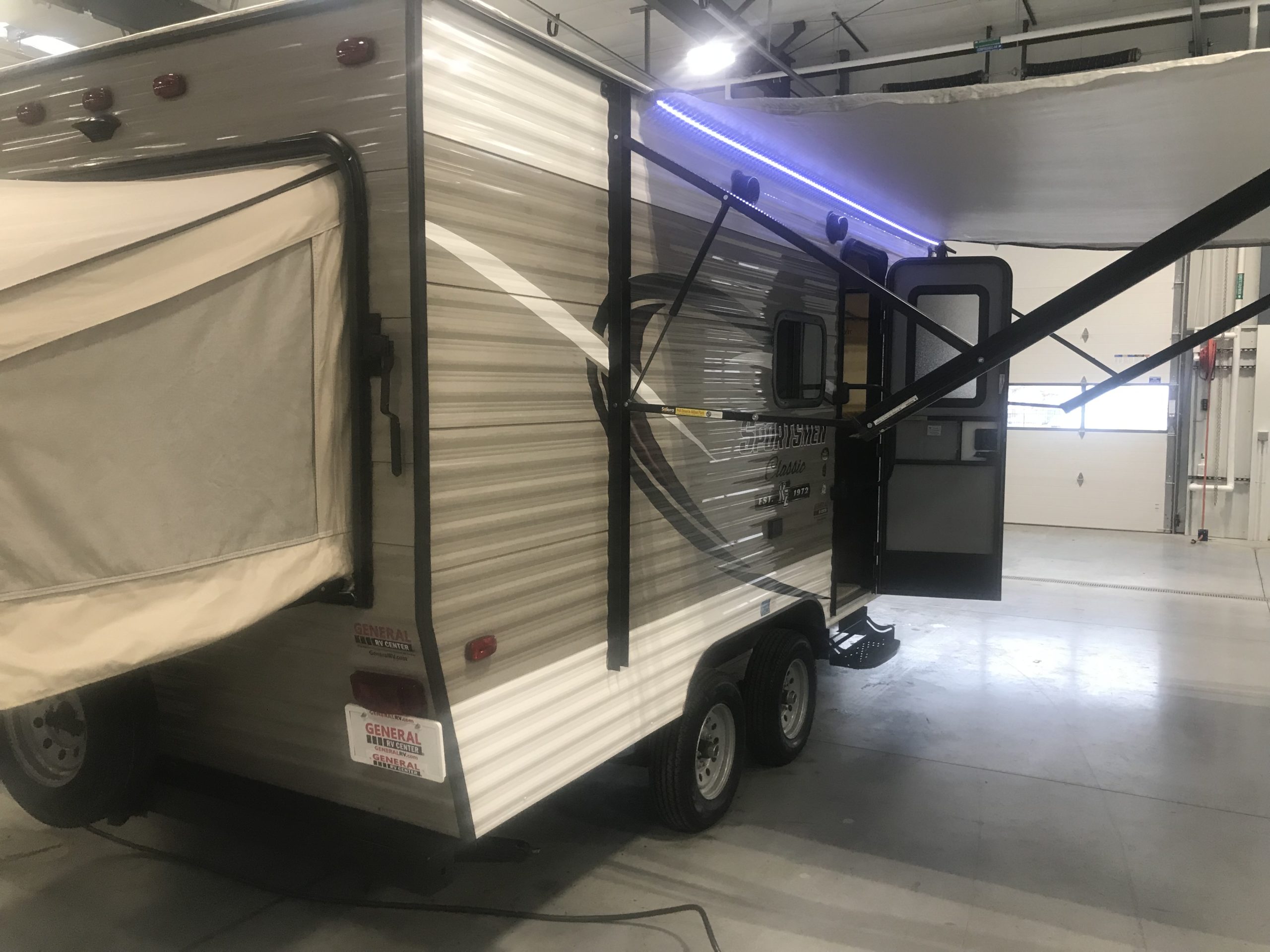 Just in a 18′ Sportsman Hybrid trailer with 3 pop out queen size beds . Also has a dinette and sofa that make beds as well, Full Bath , sink , stove ,microwave , double door refer. air , heat, hot water, TV , Bluetooth/ stereo with inside and outside speakers, large electric awning