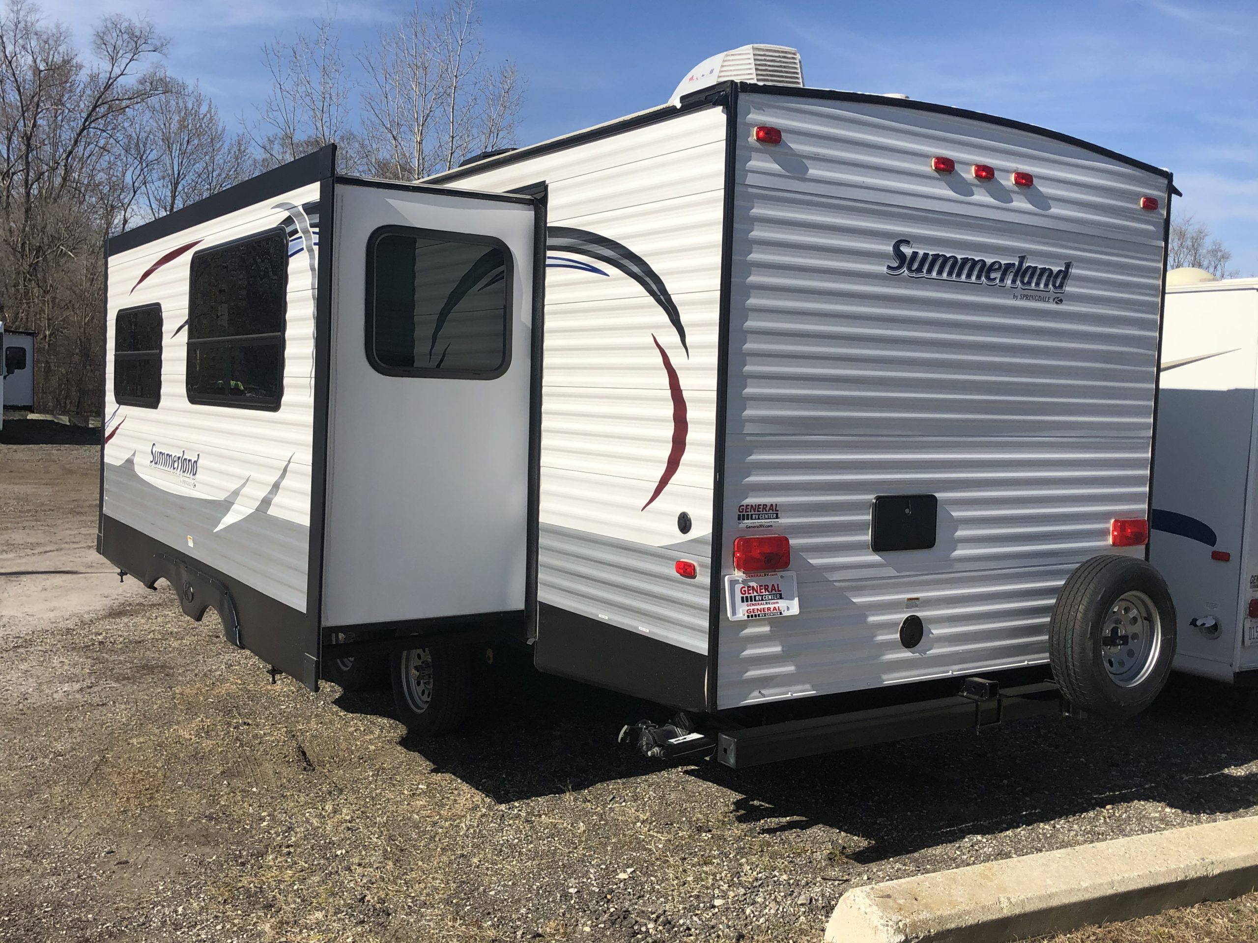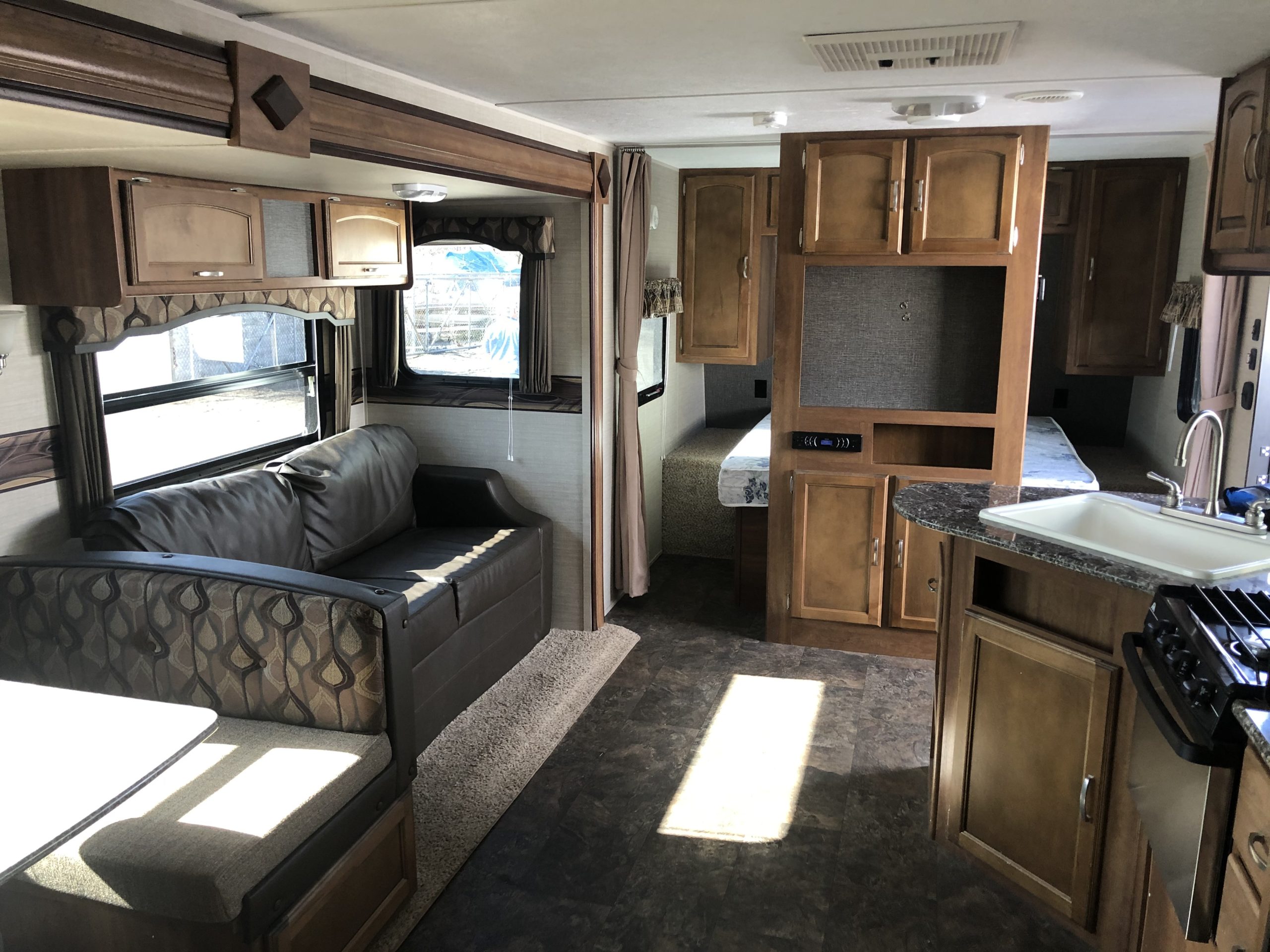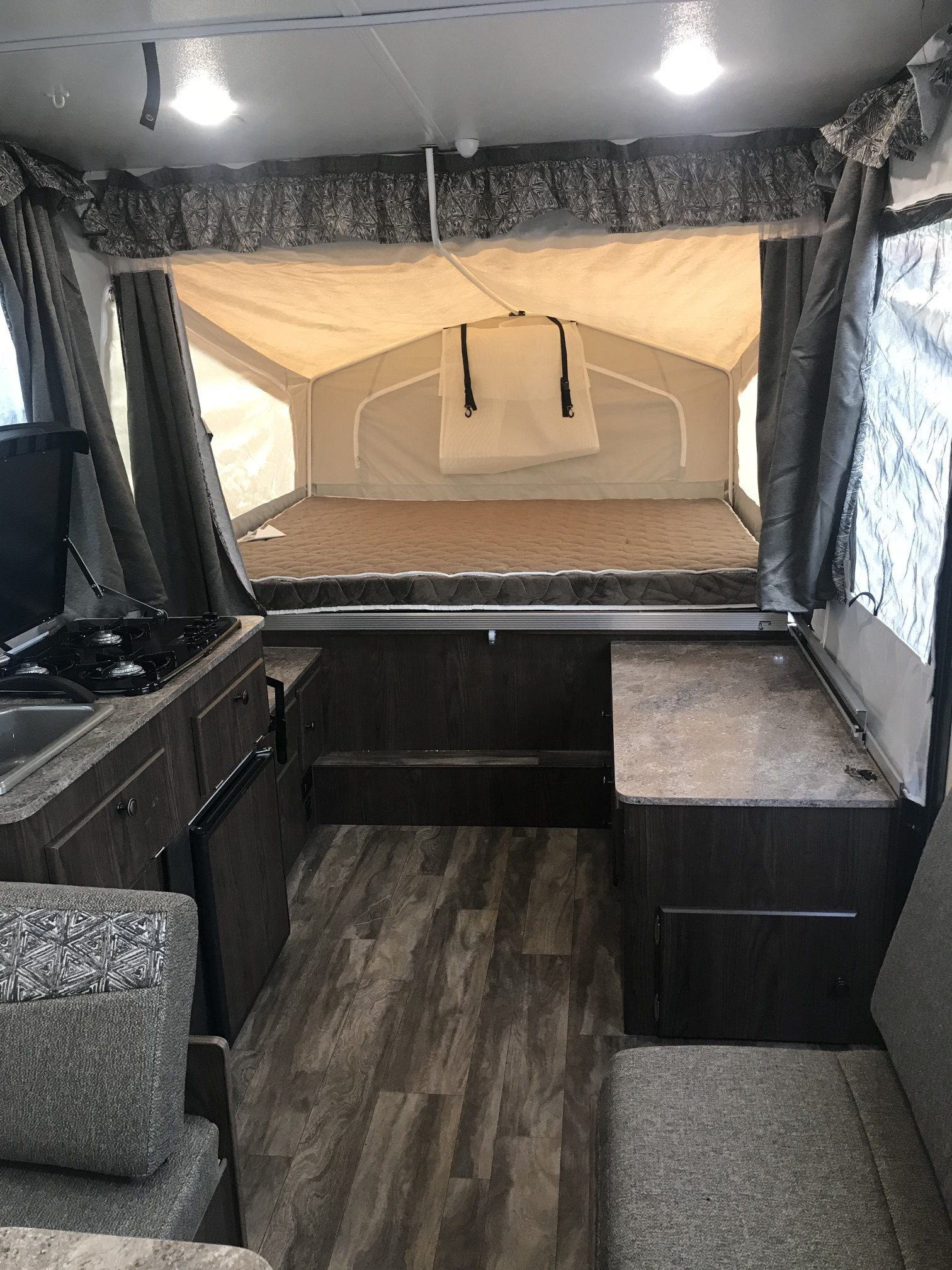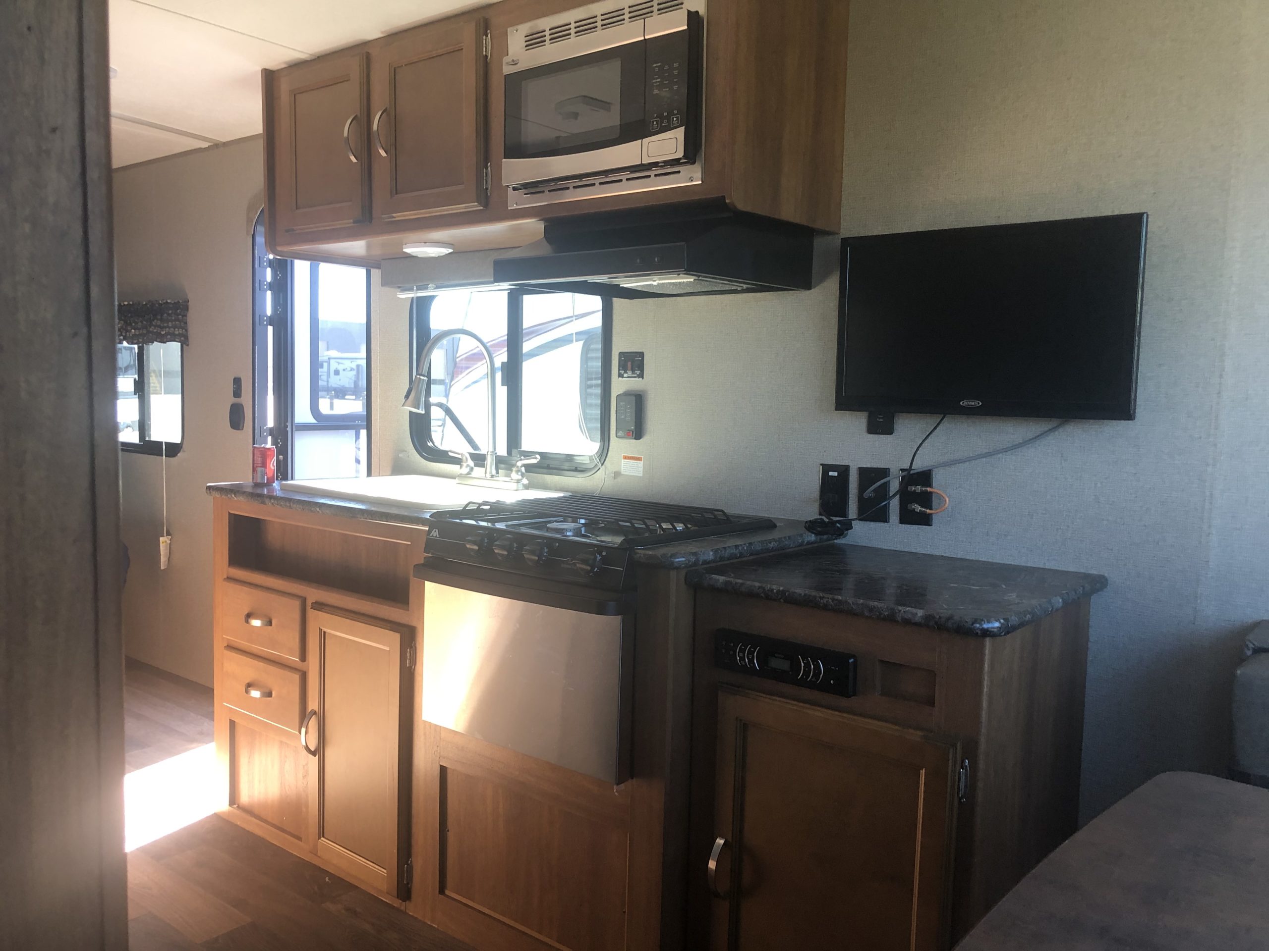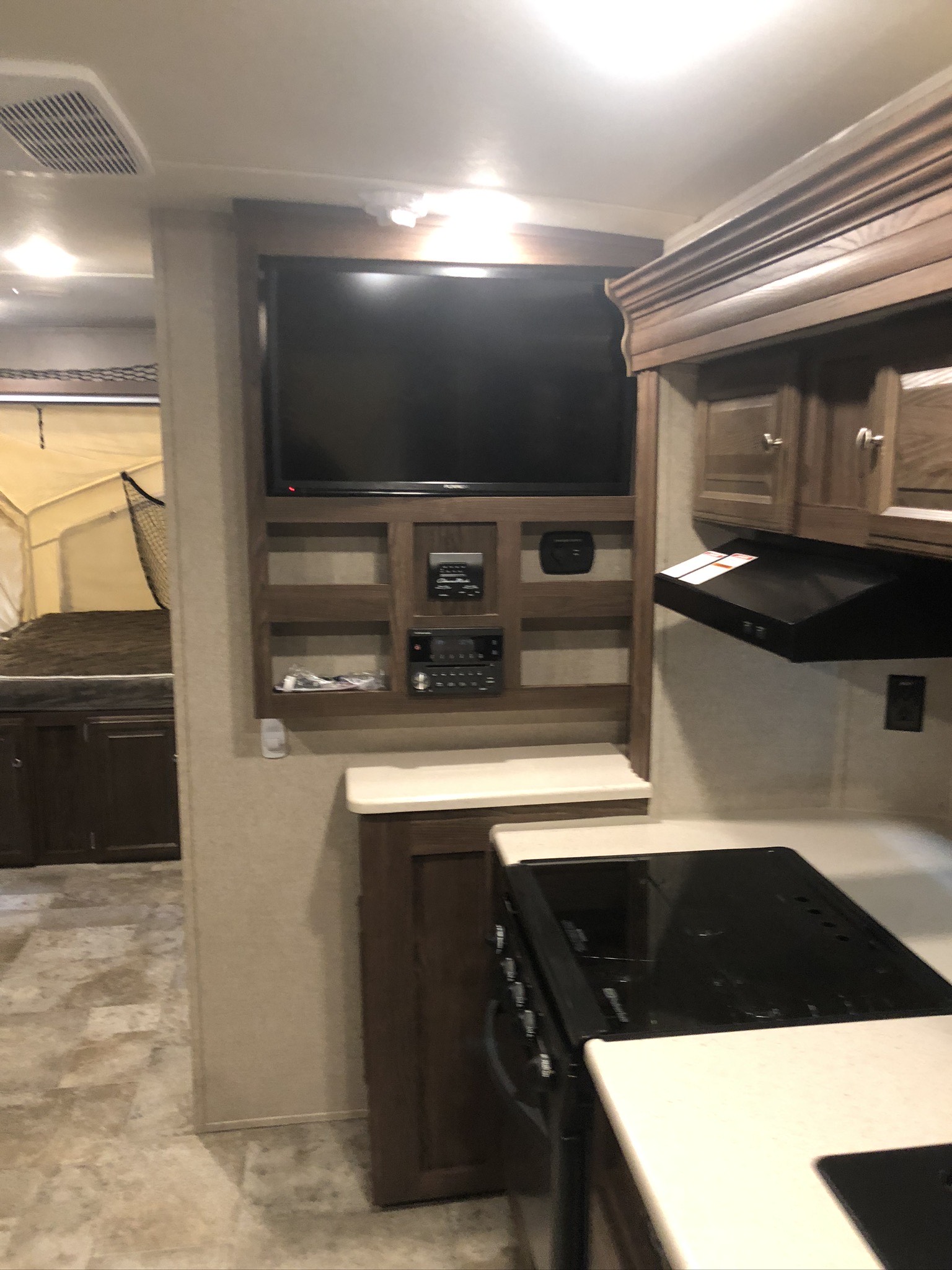 Just in a 18′ Sportsman Hybrid trailer with 3 pop out queen size beds . Also has a dinette and sofa that make beds as well, Full Bath , sink , stove ,microwave , double door refer. air , heat, hot water, TV , Bluetooth/ stereo with inside and outside speakers, large electric awning