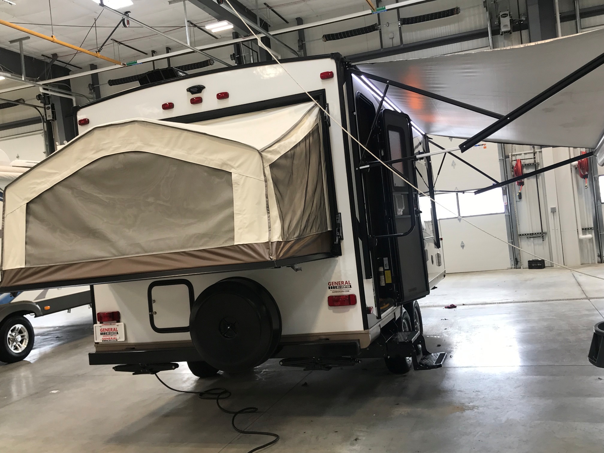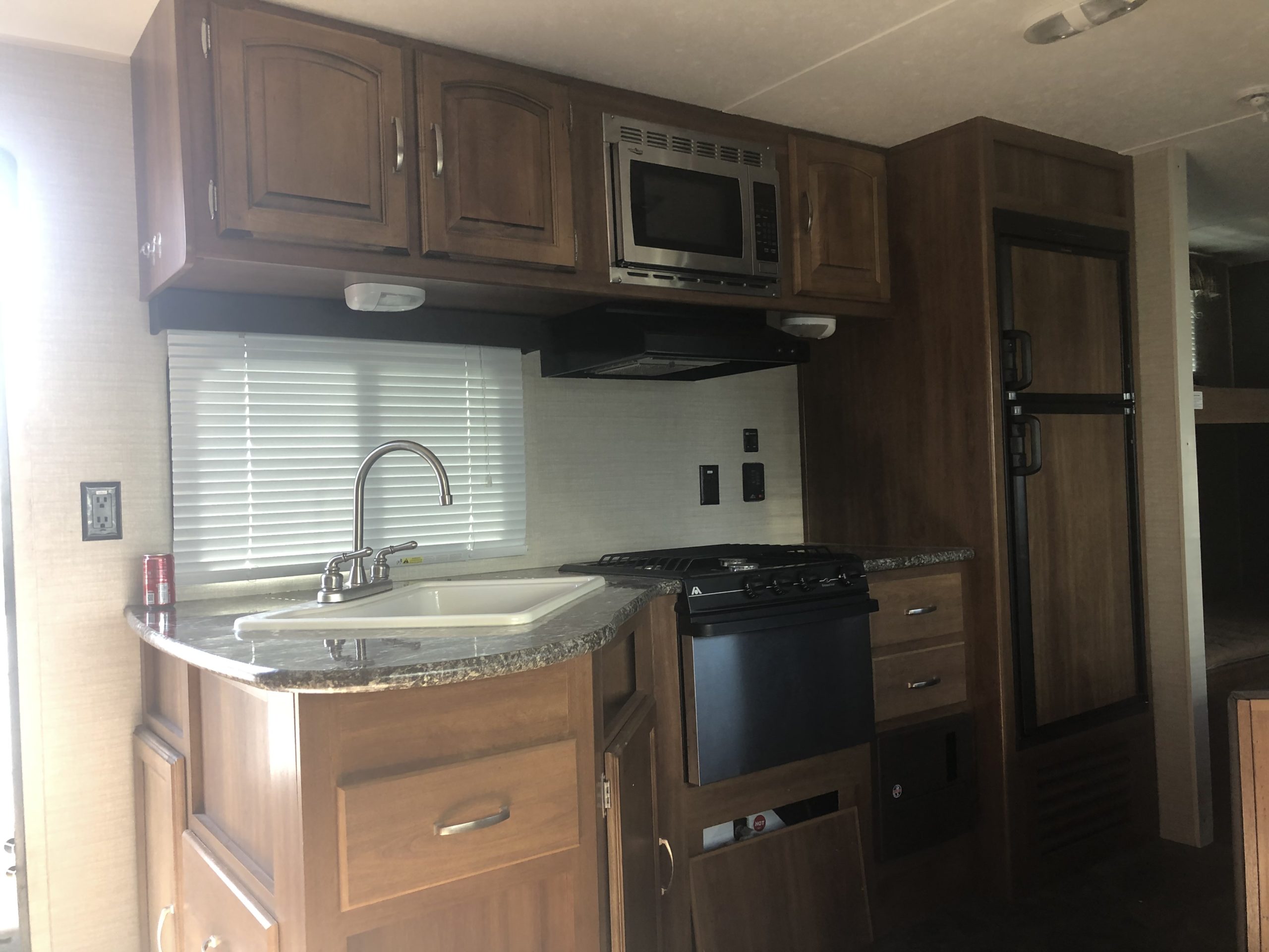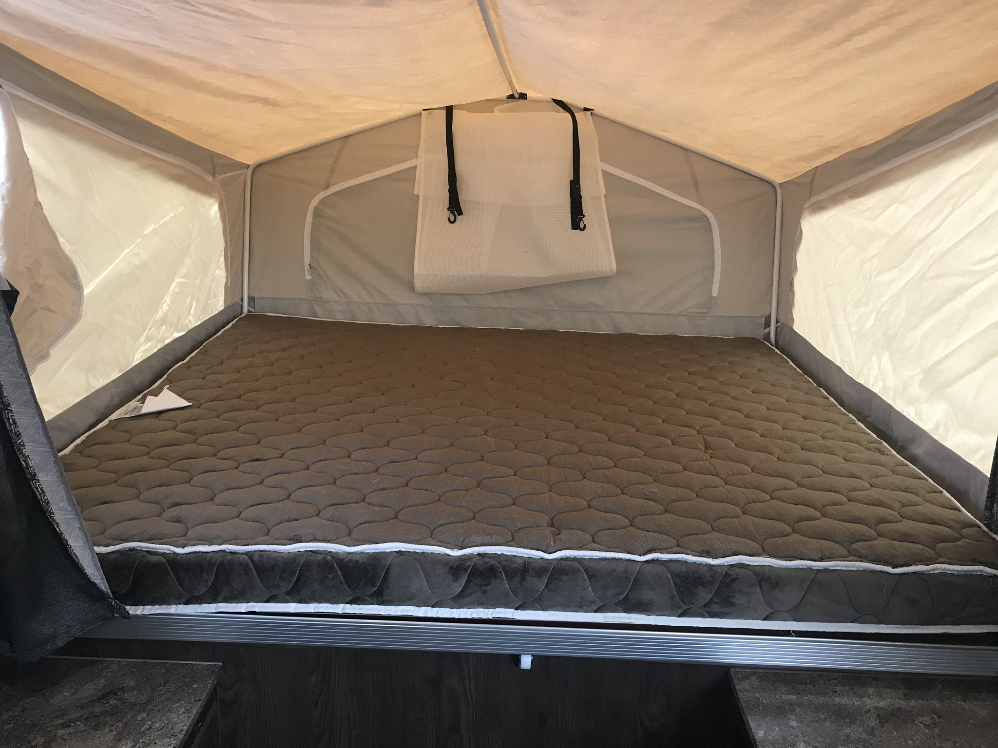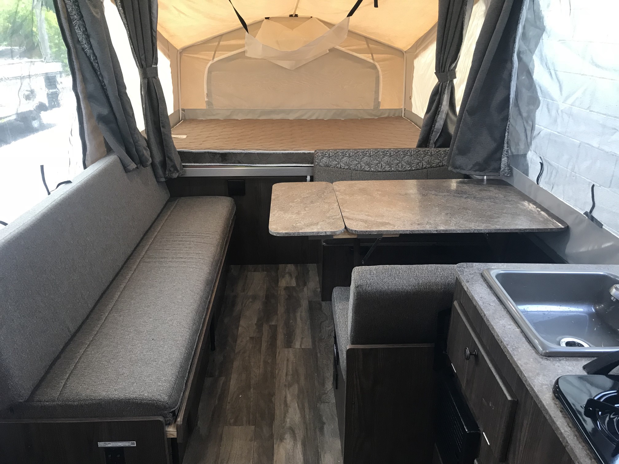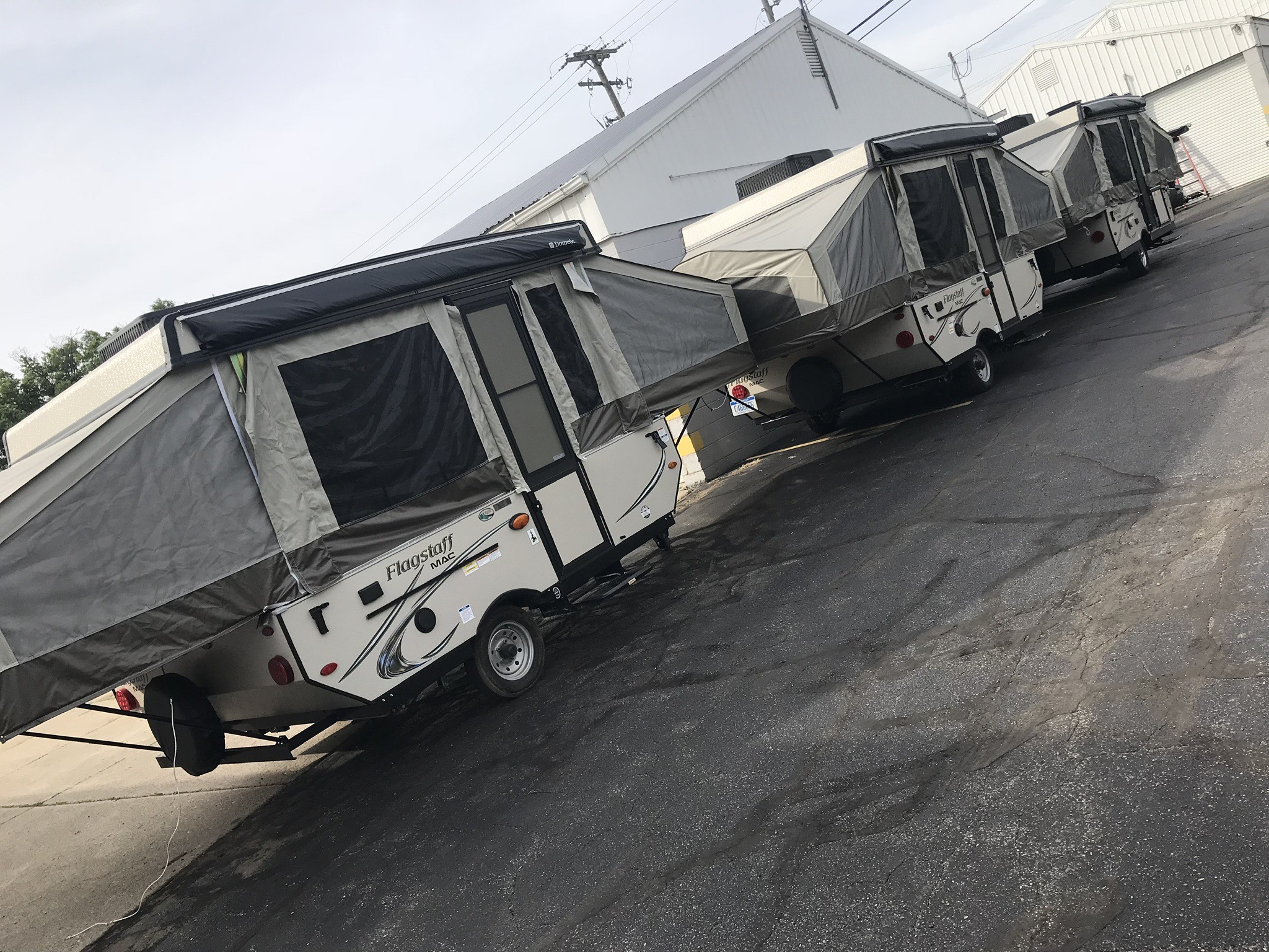 Just in a 18′ Sportsman Hybrid trailer with 3 pop out queen size beds . Also has a dinette and sofa that make beds as well, Full Bath , sink , stove ,microwave , double door refer. air , heat, hot water, TV , Bluetooth/ stereo with inside and outside speakers, large electric awning