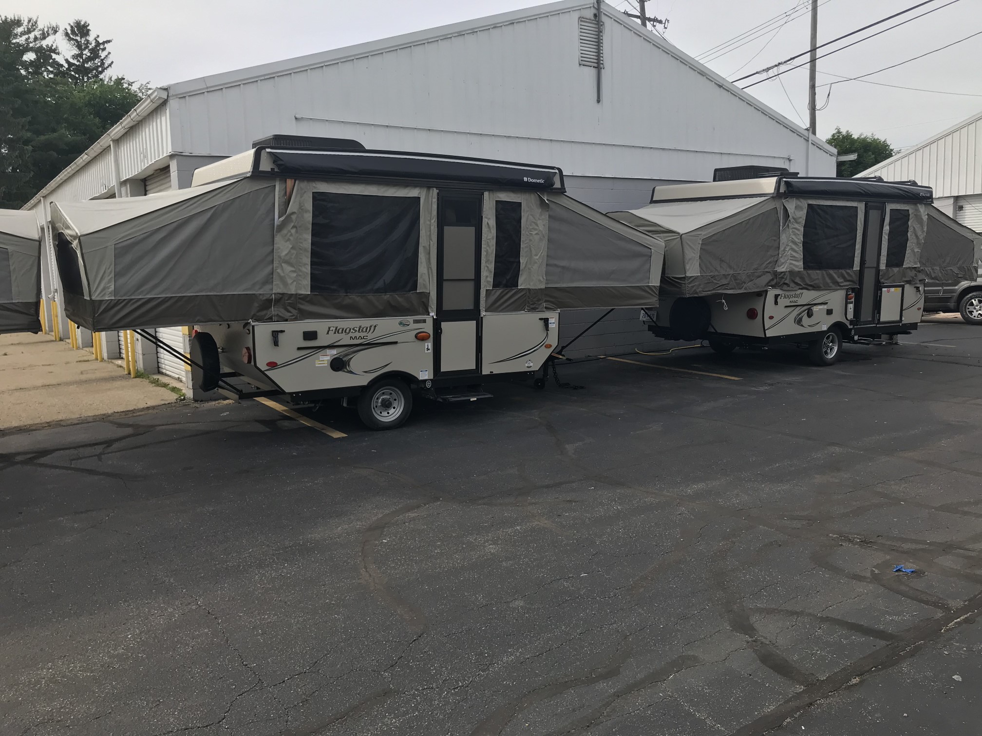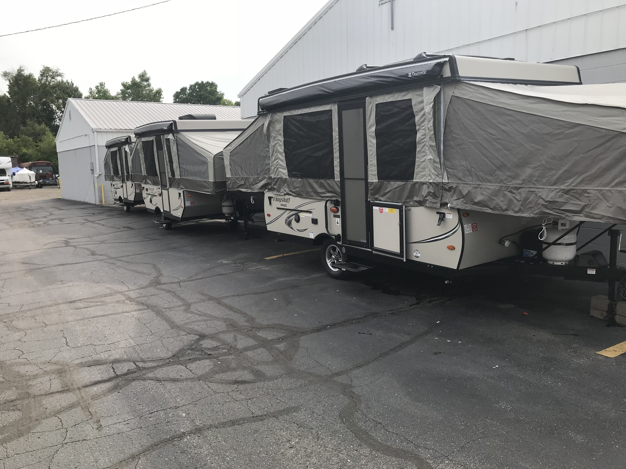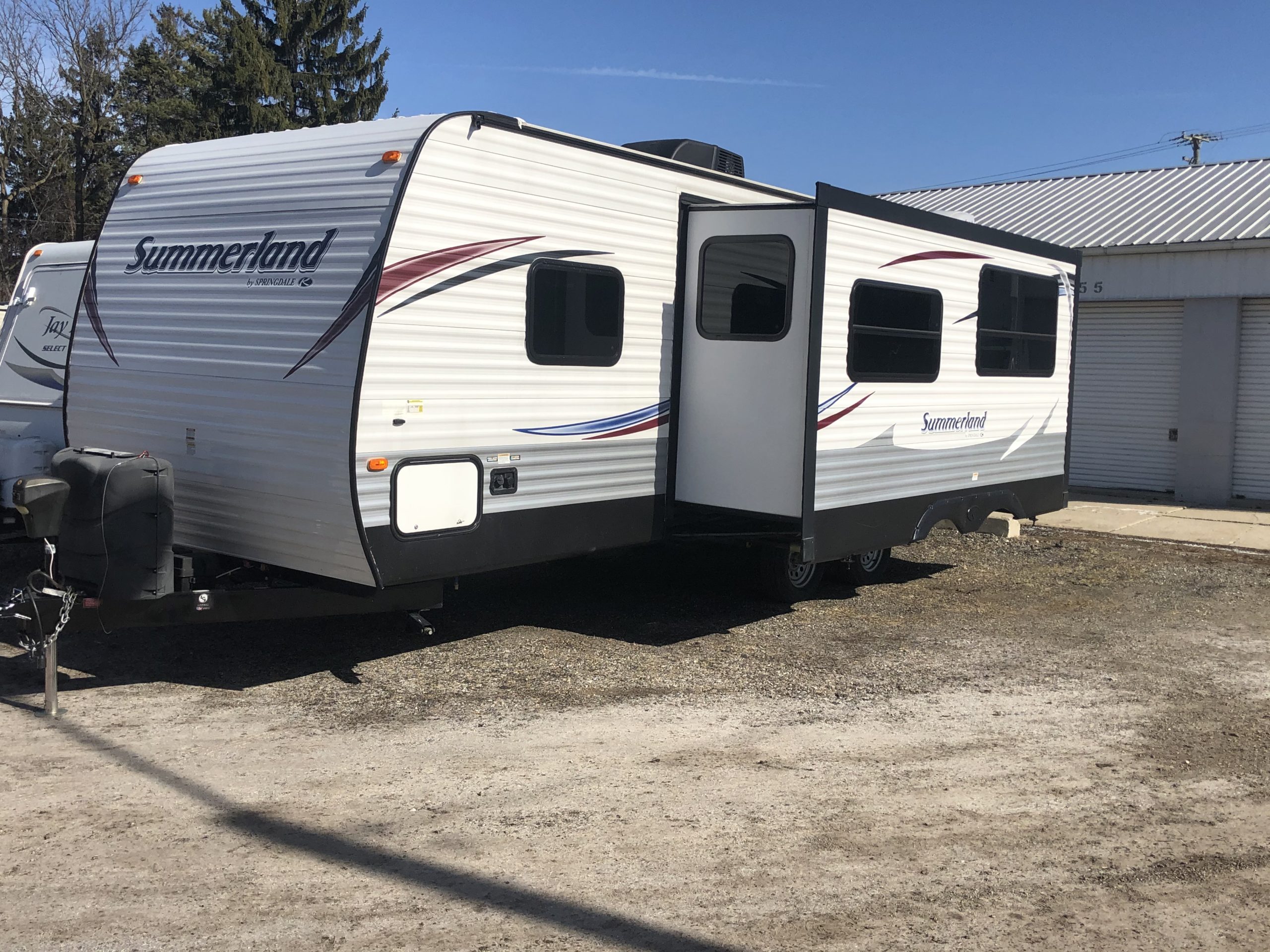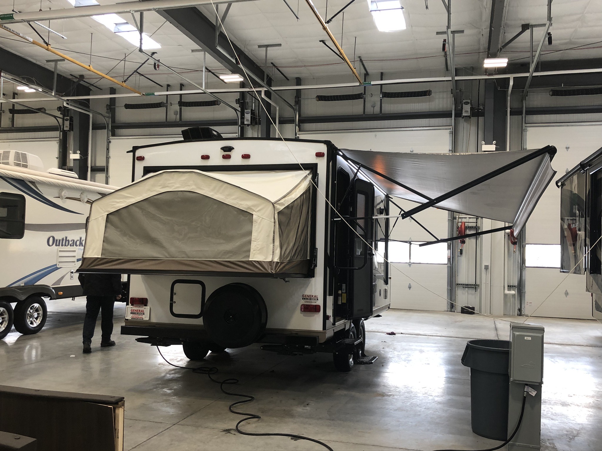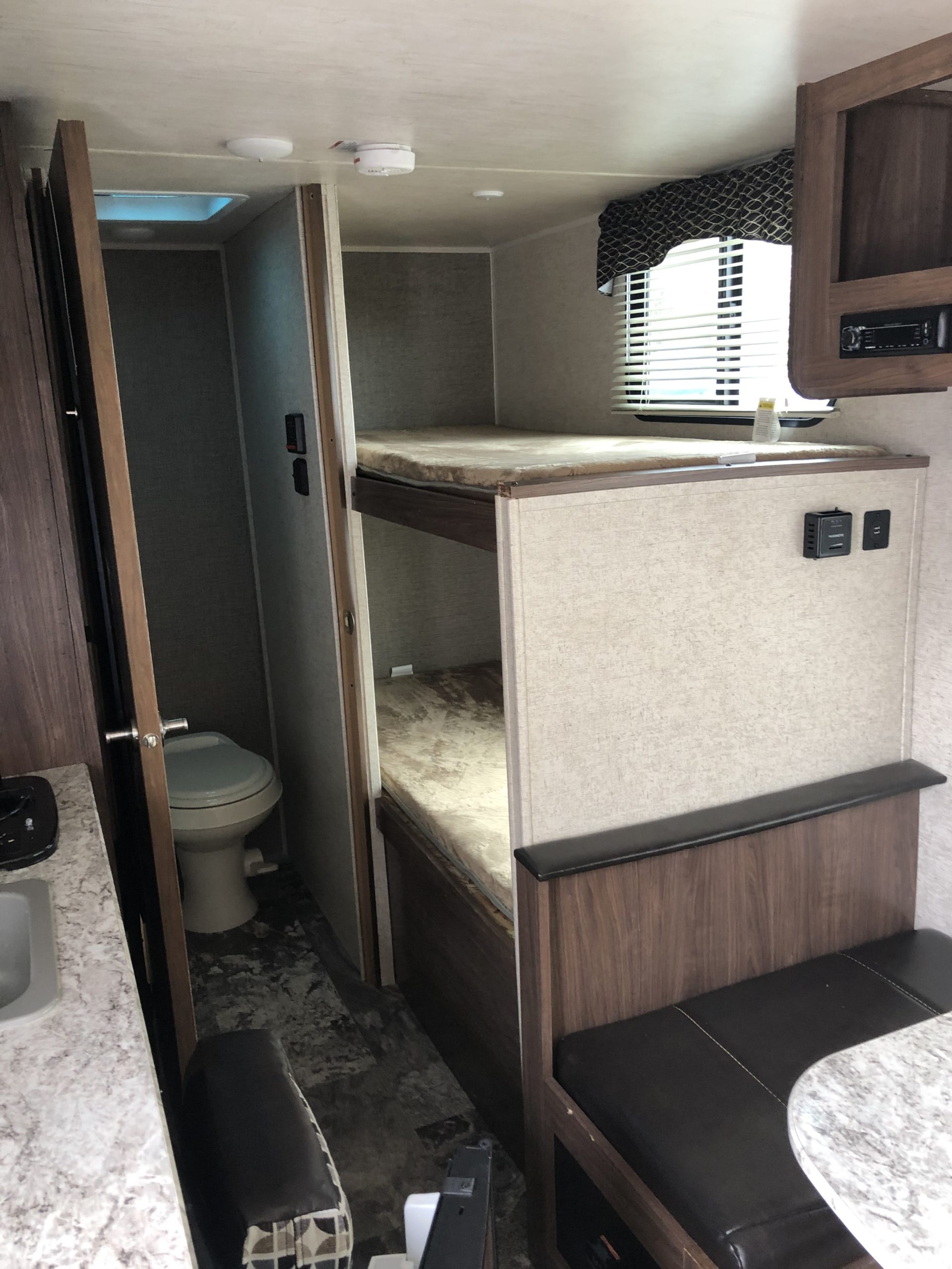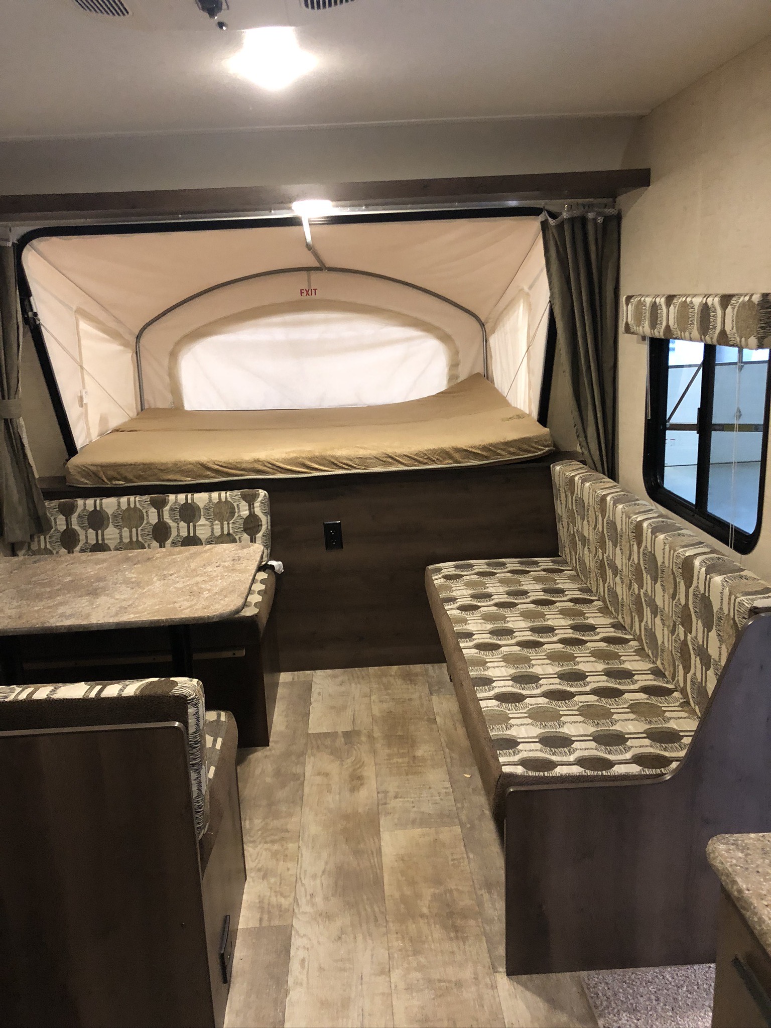 Just in a 18′ Sportsman Hybrid trailer with 3 pop out queen size beds . Also has a dinette and sofa that make beds as well, Full Bath , sink , stove ,microwave , double door refer. air , heat, hot water, TV , Bluetooth/ stereo with inside and outside speakers, large electric awning