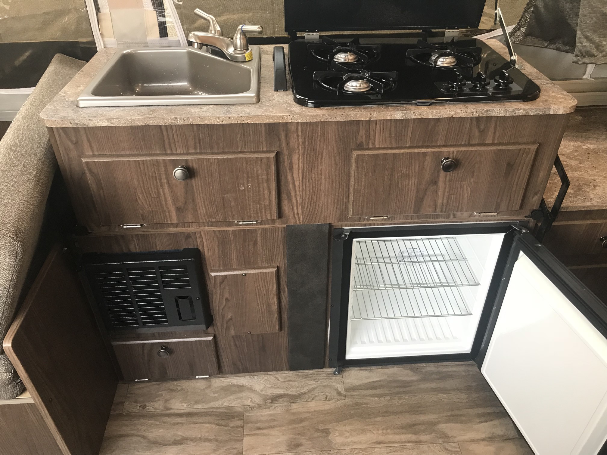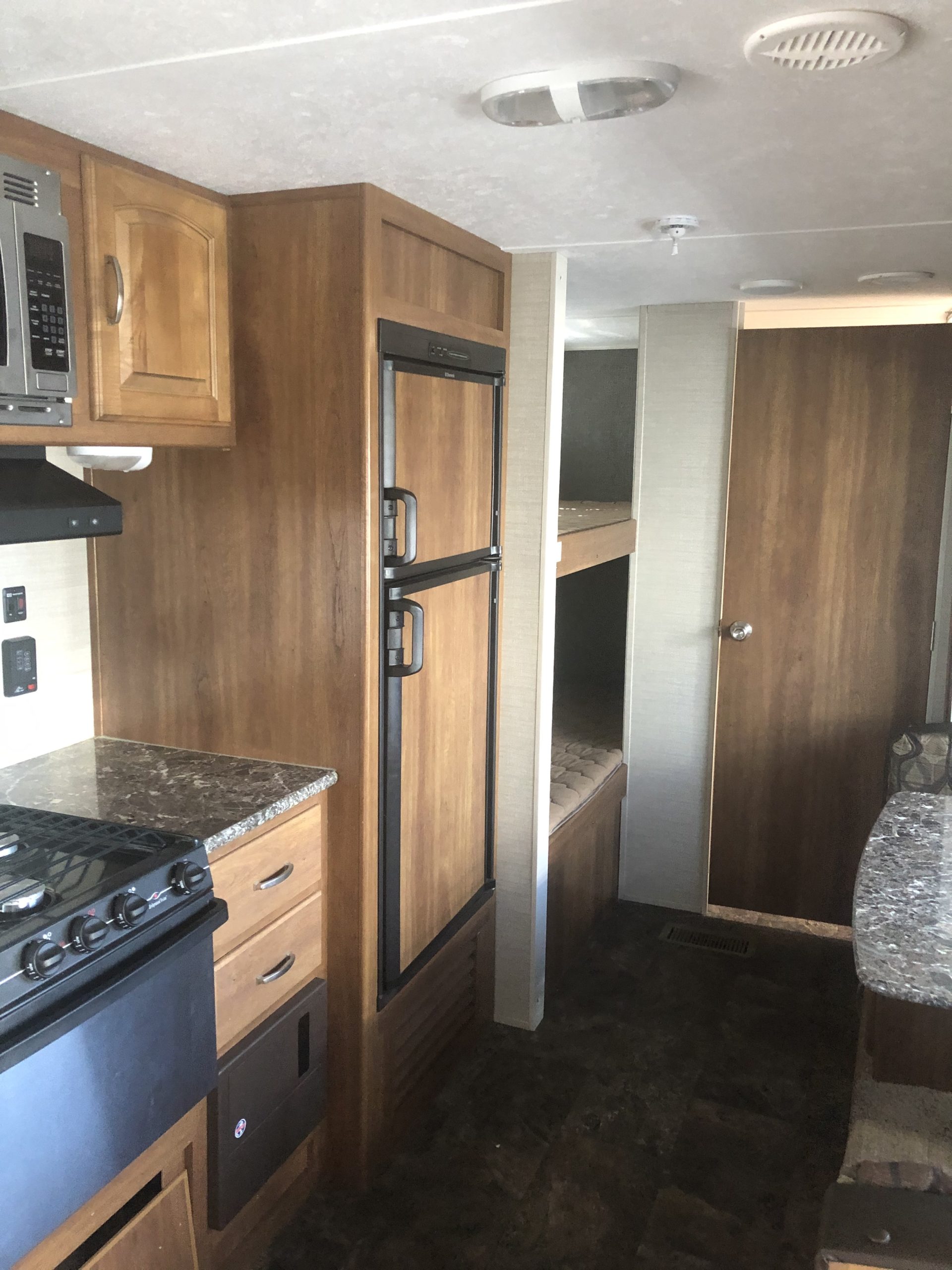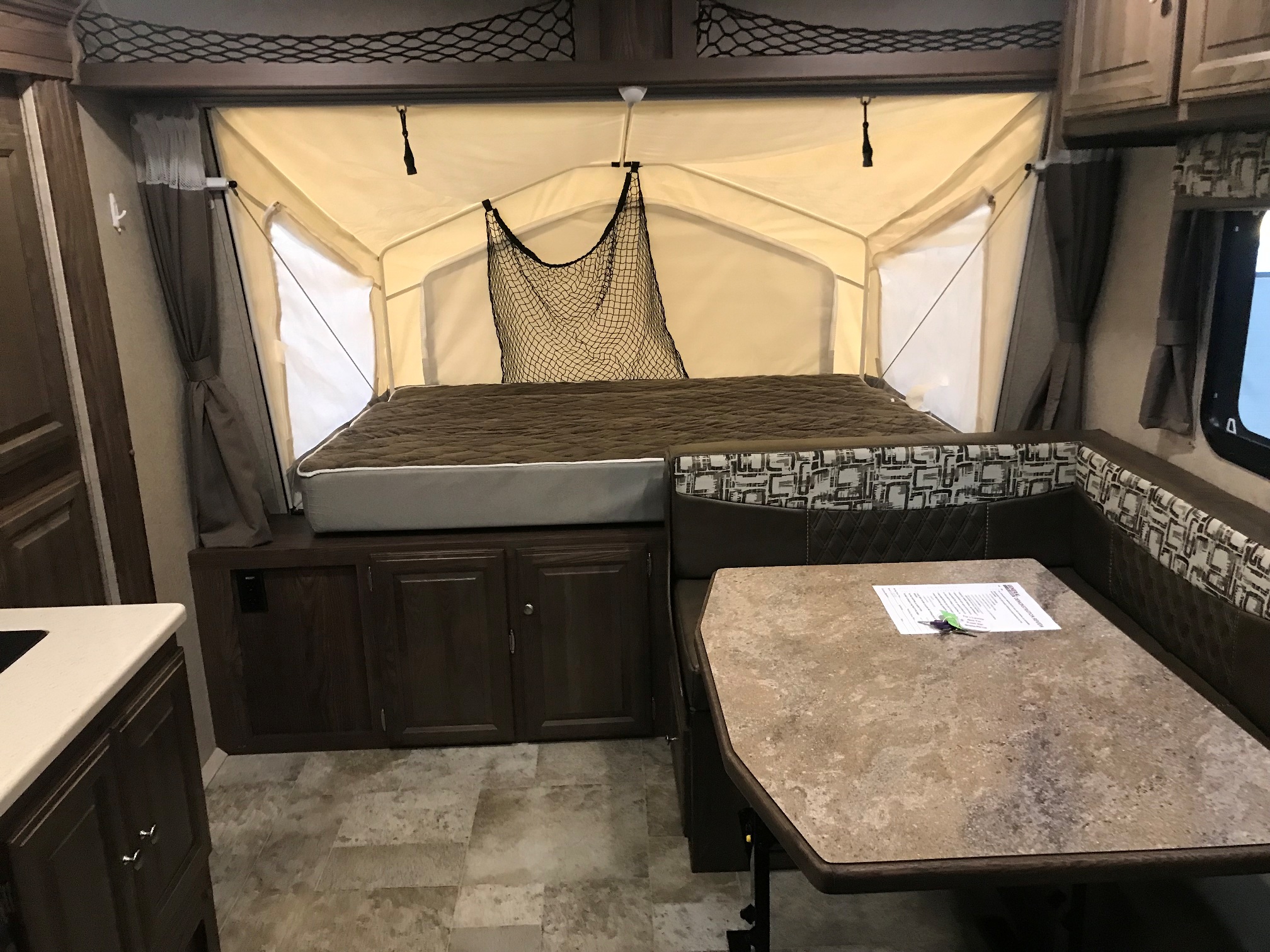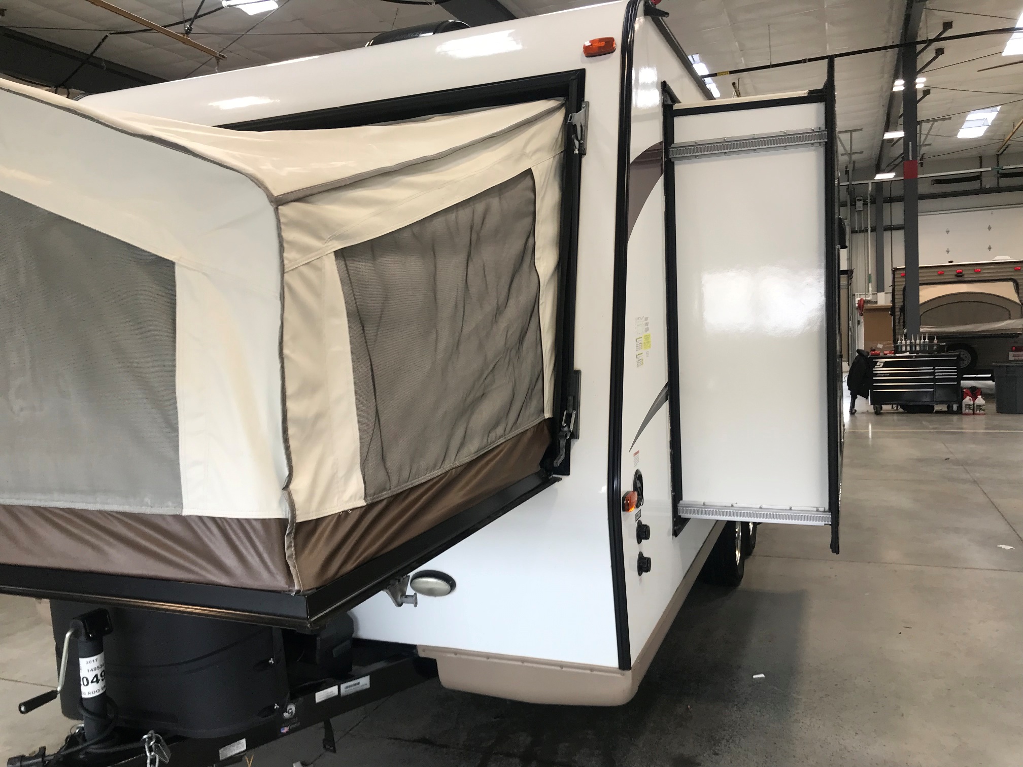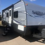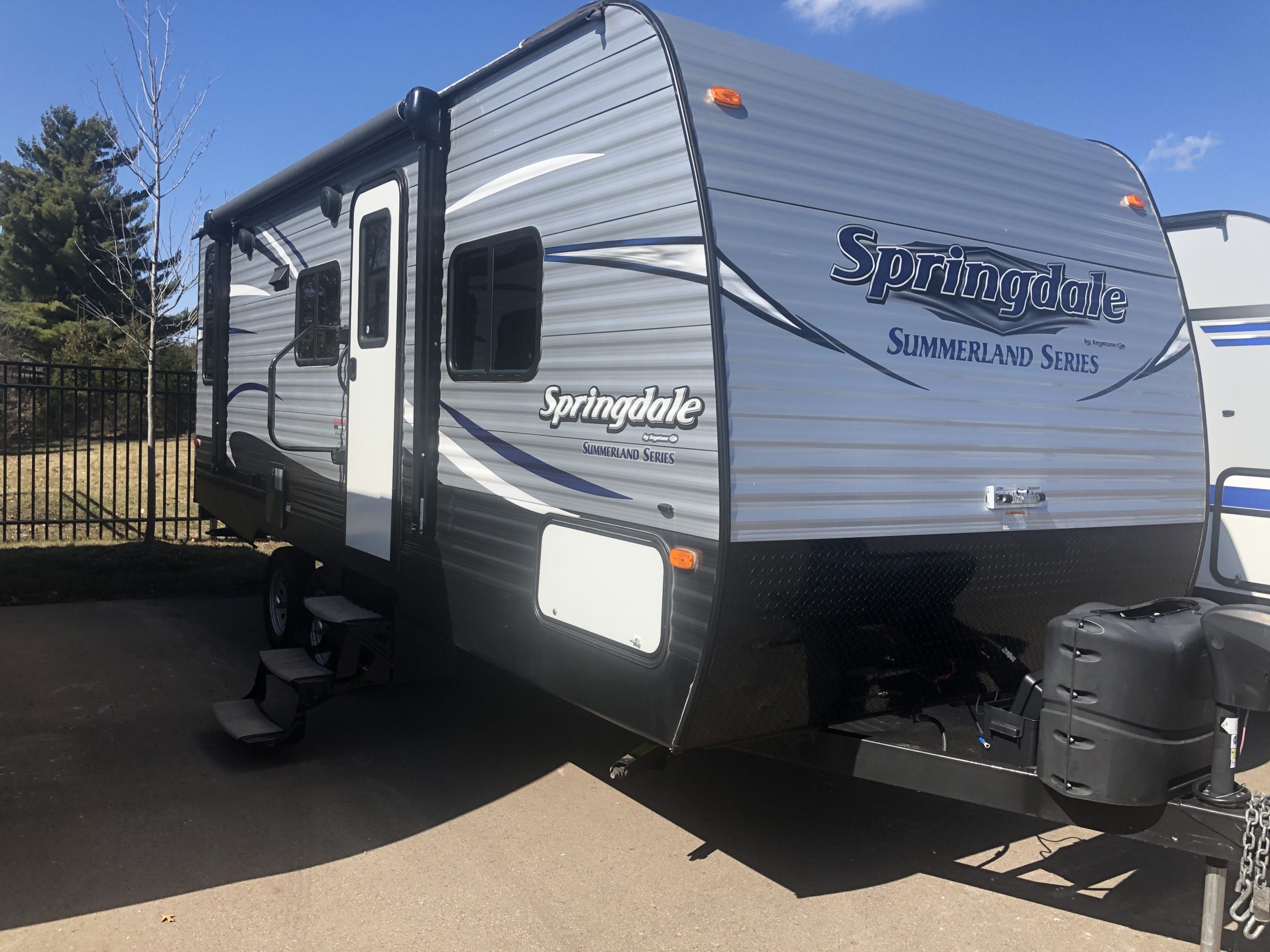 Just in a 18′ Sportsman Hybrid trailer with 3 pop out queen size beds . Also has a dinette and sofa that make beds as well, Full Bath , sink , stove ,microwave , double door refer. air , heat, hot water, TV , Bluetooth/ stereo with inside and outside speakers, large electric awning